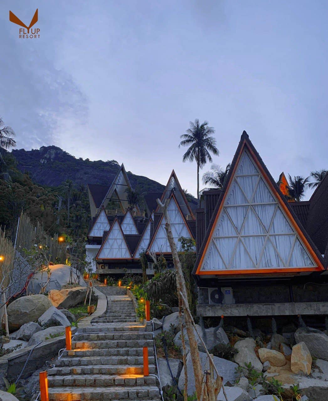 Fly Up Resort với thiết kế nhưng căn phòng nhìn xa như những ngọn núi, được xếp trên sườn núi, thiết kế này khá mới lạ và hài hòa. Thiết kế này giúp bạn có cảm giác gần gũi với thiên nhiên nhưng vẫn tận hượng trọn vẹn mọi dịch vụ hiện đại.