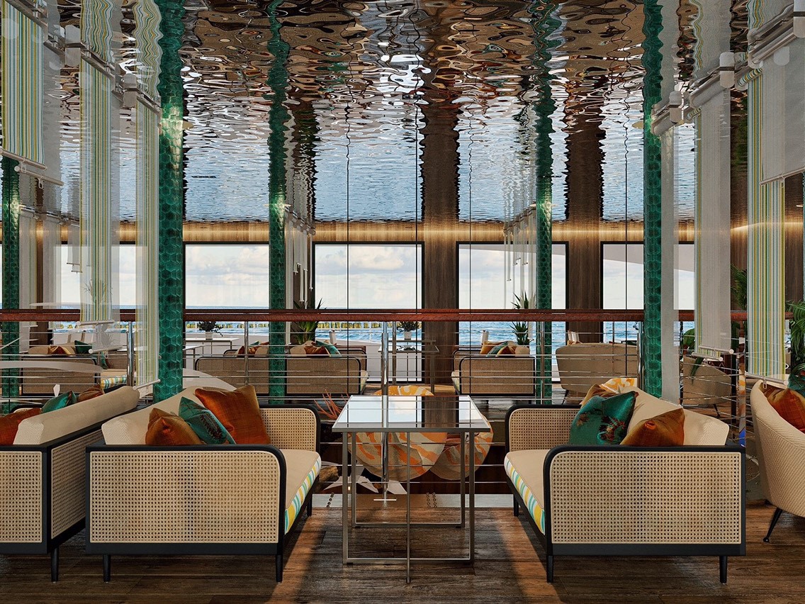 - Tầng 3 thiết kế quán bar view 360 độ để du khách thưởng ngoạn toàn cảnh của vùng biển Phú Quốc trong nhiều khoảnh khắc, check in sang chảnh giữa biển khơi và một không gian kiến trúc độc đáo. Ngoại vi của du thuyền là hệ thống cầu phao phục vụ khách tham quan check in và các môn dịch vụ vui chơi không kém phần hấp dẫn khác: thuyền thúng đáy kính tham quan rạn san hô, jeky, phao chuối…
